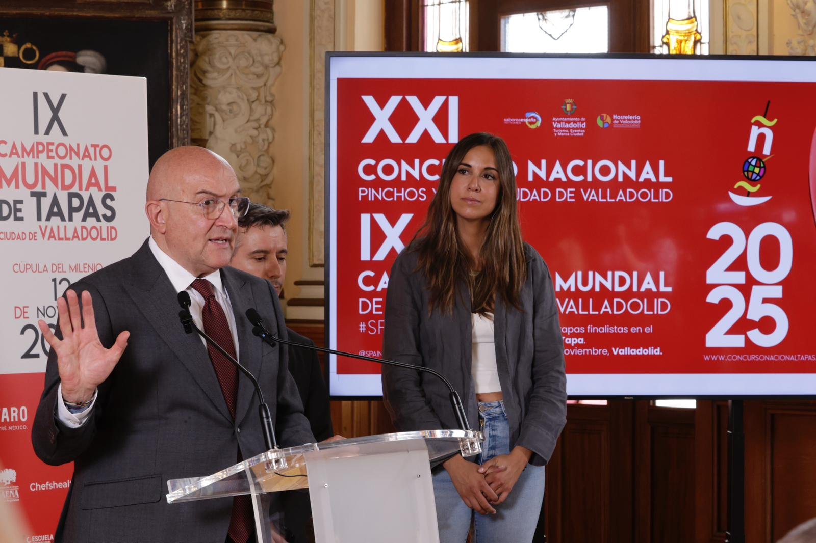 El mes de noviembre volverá a situar a Valladolid en el mapa gastronómico a nivel nacional y mundial con la celebración de los concursos gastronómicos de alta cocina en miniatura. El XXI Concurso Nacional de Pinchos y Tapas ‘Ciudad de Valladolid’ y el IX Campeonato Mundial de Tapas ‘Ciudad de Valladolid’ se celebrarán del 10 al 12 de noviembre en la sede oficial de ambos certámenes: la Cúpula del Milenio. Las dos ediciones han sido presentadas hoy por el alcalde de Valladolid, Jesús Julio Carnero, junto con la concejala de Turismo, Eventos y Marca Ciudad, Blanca Jiménez, el presidente de la Asociación Provincial de Empresarios de Hostelería, Jaime Fernández, la directora técnica del Concurso Nacional, Ana García, y el director técnico del Campeonato Mundial, Ángel Moretón.