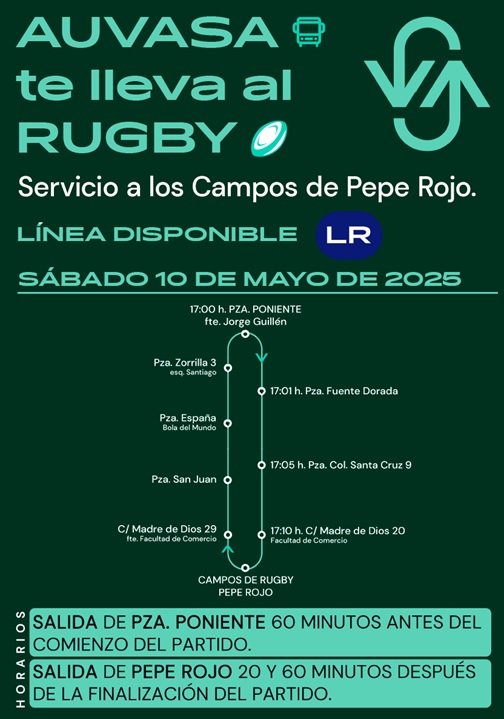 El sábado 10 de mayo, a las 18:00h, se llevará a cabo el partido de semifinales de la liga de División de Honor entre los equipos de rugby de la ciudad, VRAC Quesos Entrepinares y el INEXO El Salvador, en los Campos Pepe Rojo. Para este encuentro, AUVASA ofrecerá una línea especial lanzadera desde la Plaza de Poniente, con salidas una hora antes del partido y paradas estratégicas en diferentes puntos de la ciudad.