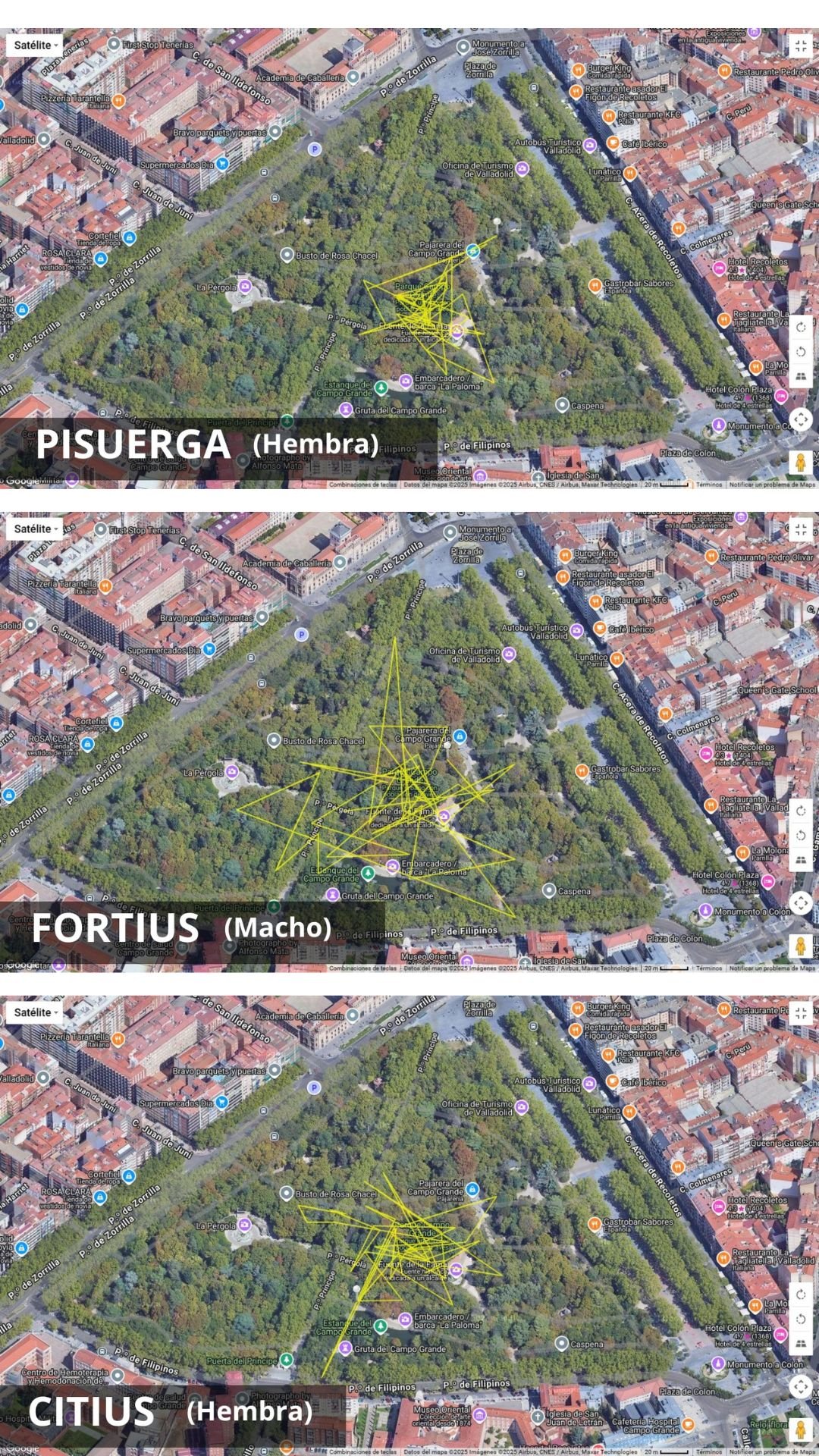 Citius, Fortius y Pisuerga (hembra, macho y hembra, respectivamente) ya se han lanzado varias veces desde el nido para practicar varios vuelos cortos por el Campo Grande, 3 semanas después desde que el proyecto ‘Pennatus’ llevará a cabo el anillamiento y equipamiento con emisores GPS/GSM.