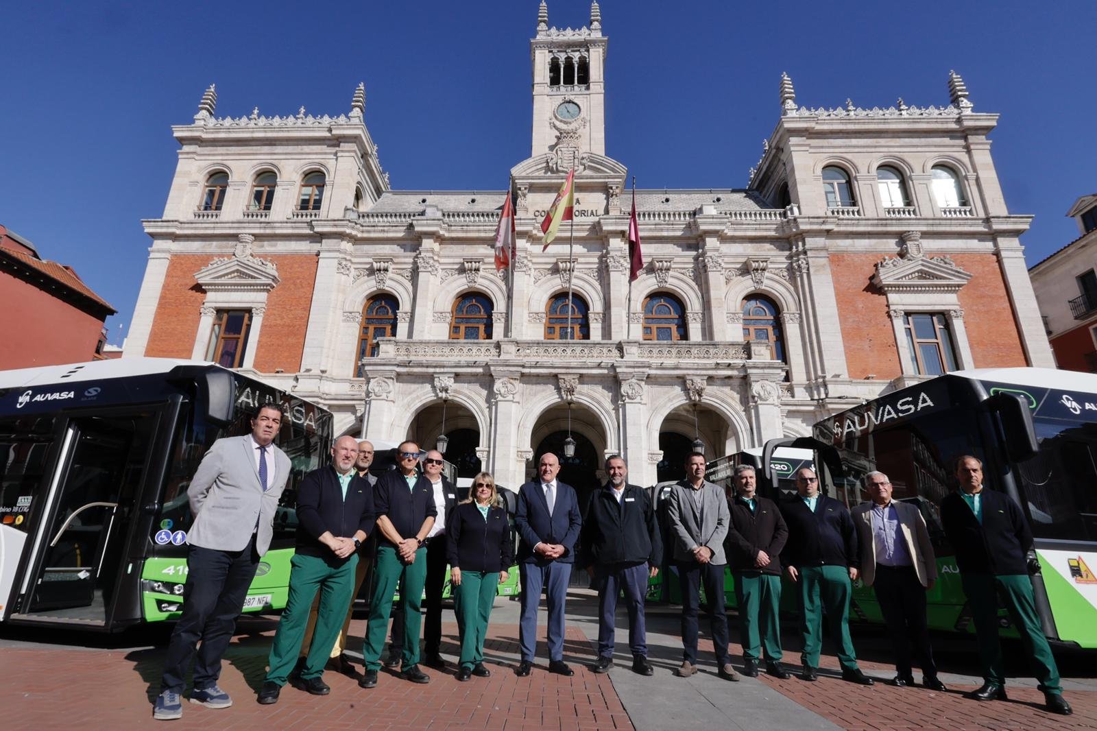 El alcalde de Valladolid, Jesús Julio Carnero, ha presentado hoy en la Plaza Mayor de Valladolid los nuevos autobuses que comienzan a prestar servicio en la ciudad como parte de la flota de AUVASA. Se trata de 6 autobuses articulados de 18 metros, de alta capacidad, suministrados por la empresa SOLARIS BUS Ibérica en el ámbito del acuerdo marco para la adquisición de autobuses accionados por GNC (gas natural comprimido), y que han supuesto una inversión de 3.102.924 euros (IVA incluido).