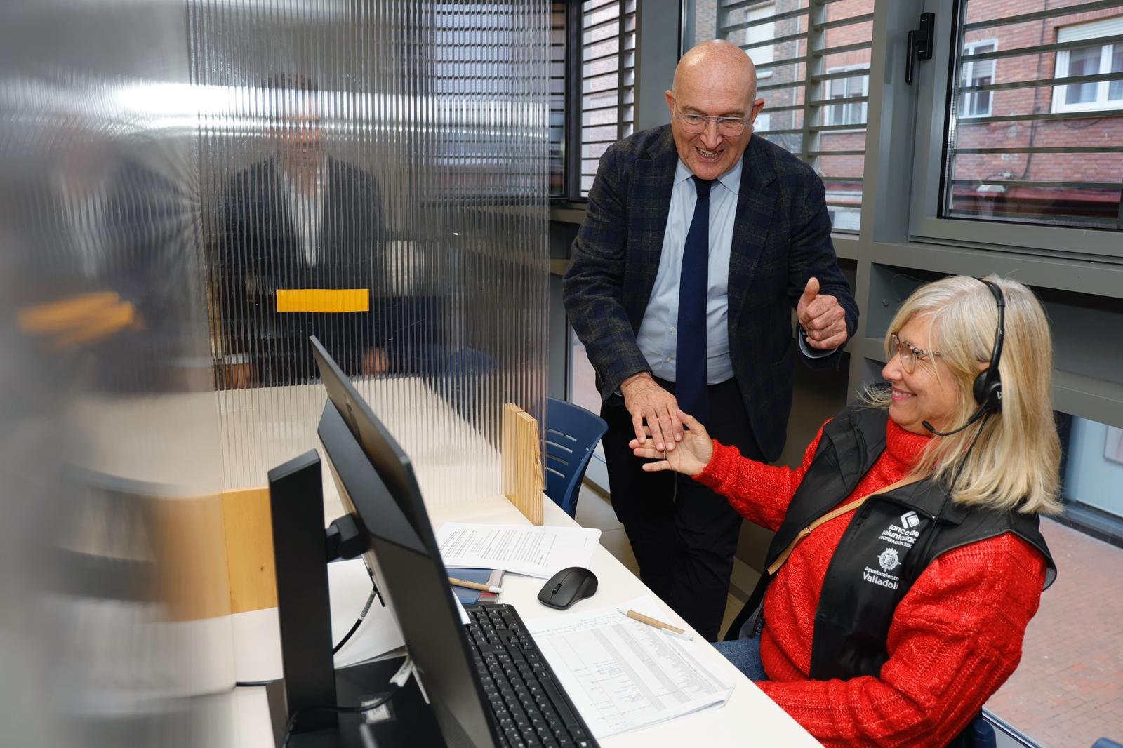 El alcalde de Valladolid, Jesús Julio Carnero, acompañado del concejal de Personas Mayores, Familia y Servicios Sociales, Rodrigo Nieto, y representantes de Telefónica, ha visitado hoy la sala municipal donde se realizan las llamadas del Proyecto Pérgola, una iniciativa innovadora que combina tecnología y acompañamiento humano para detectar posibles situaciones de soledad no deseada entre las personas mayores.