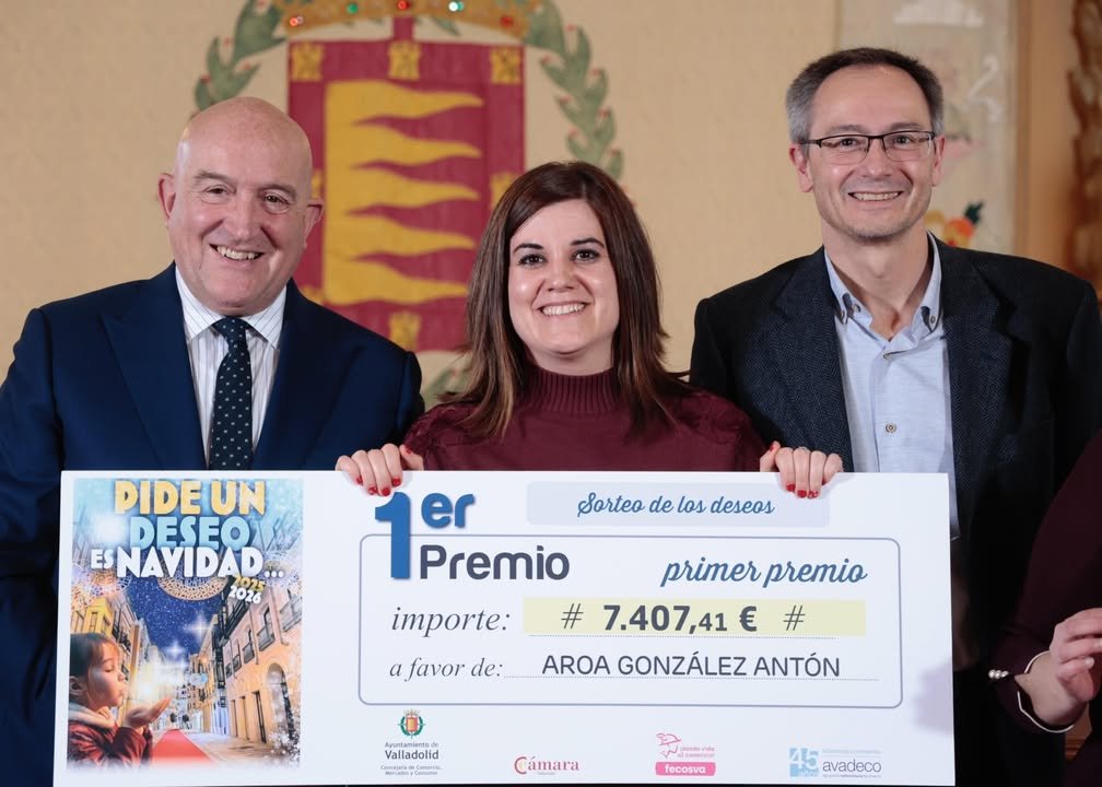 El alcalde Jesús Carnero ha entregado los premios del tradicional sorteo de ‘El Árbol de los Deseos’, acompañado por el concejal Víctor Martín y representantes de la Cámara de Comercio de Valladolid, Avadeco Valladolid y Fecosva.