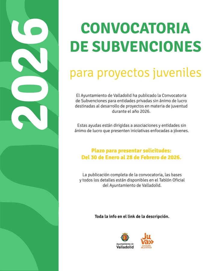 El Ayuntamiento de Valladolid ha publicado la Convocatoria de Subvenciones para entidades privadas sin ánimo de lucro destinadas al desarrollo de proyectos en materia de juventud durante el año 2026. Esta convocatoria, bajo el hashtag #JuVadeTi, busca apoyar iniciativas que promuevan el bienestar y la participación activa de la juventud en la sociedad.