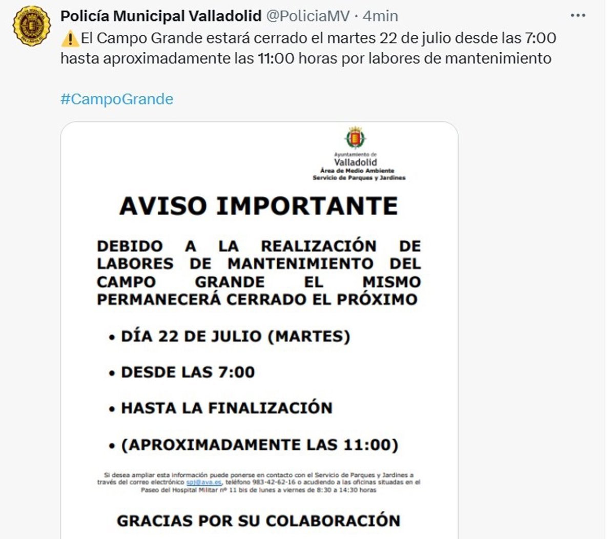 El Campo Grande de Valladolid cerrará durante unas horas en la mañana del martes 22 de julio para llevar a cabo labores de mantenimiento. Según ha informado la Policía Municipal a través de su perfil en la red social ‘X’ (PoliciaMV) y recogido por Europa Press, el cierre se extenderá desde las 7.00 horas hasta aproximadamente las 11.00 horas.