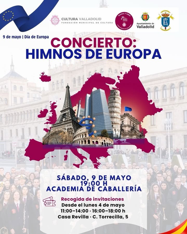 La actuación, titulada «Concierto Himnos de Europa», tendrá lugar el sábado 9 de mayo en la Academia de Caballería de Valladolid a las 19:00 h. La entrada es gratuita por invitación previa, que puede ser recogida en Casa Revilla (C. Torrecilla, 5) a partir del 4 de mayo en horario de 11:00 a 14:00 y de 16:00 a 18:00 h.