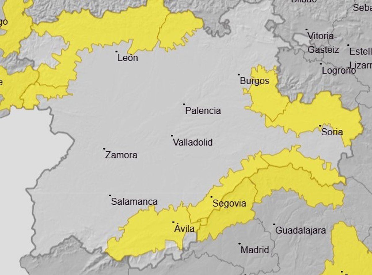 El aviso afecta al Sistema Central de Ávila, la Ibérica de Burgos, la Cordillera Cantábrica en León y Palencia, el Sistema Central de Segovia y Soria, donde también se mantiene el aviso en la Ibérica, y la zona de Sanabria en Zamora.